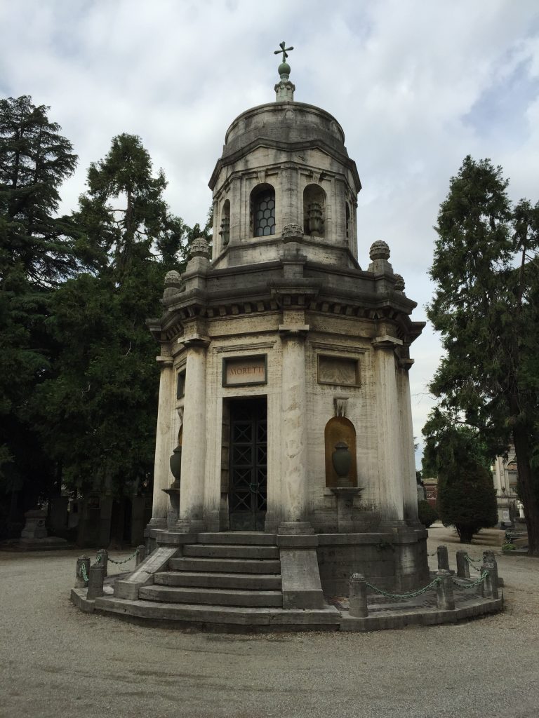 Buildings, by their very nature, embody the stories of their creation and the messages their patrons wish to project. Later observers are rarely privy to the real history, but we know it when we come across a monument that’s skewed or clunky. The designers of Mausolus’s tomb created something massive, yet balanced. The sculptural adornment was rich, but subordinate to the overall form. This idea of a hierarchy of the elements that impact visitors at various scales or from various distances is one of the great tools designers use whether designing a tomb or a tea service. Epstein used another in his work for Wilde’s grave, the history and legacy of an individual. The sculpture he created is asymmetrical, stable, strong in overall form, and like King Mausolus’s tomb, detailed with smaller narrative elements. The Moretti tomb offers us a similar confident presence in the landscape. Looking at it in a photograph we might be inclined to edit the scale of the lantern up or down, but stumbling upon this majestic tempietto on a first visit to the Cimitero Monumentale and considering it in the liberated, experimental context of Stile Liberty, we can see how its patrons concluded that they had made the right decision. They were then free to recede gradually into extinction and obscurity.