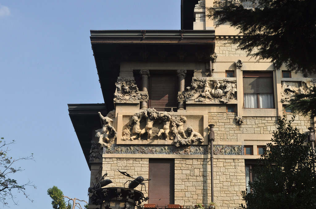 I was compelled to look into its history. Although there are many classical elements incorporated into its design, with its stylized classicism and peculiar moldings, the Moretti Tomb opened up the world of Milanese Stile Liberty buildings. The stylistic treatment is a clue to its authorship by Giuseppe Sommaruga, a preeminent Liberty architect of the period. Unlike other Liberty proponents, his personal approach was to blend classical elements with more organic forms and ornamentation. However, I discovered that he had two prominent colleagues with the surname Moretti. One would assume they would have designed any tomb commissioned by their own families. As well, online sources seem to confuse a smaller mausoleum by Sommaruga nearby with this one. The Moretti name is common enough that determining which industrialist family (beer, shipping, raincoats) may have been the original patrons remains unanswered. All of this renders it difficult to determine whether the recent rash of online articles about the transfer of rights cites the correct architect. The uncertainty serves to pique curiosity all the more.