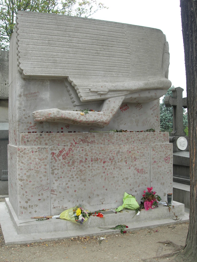 The Sphinx is the work of an American-English sculptor, Jacob Epstein, with an architectural setting created by architect Charles Holden. Arguably the modern, streamlined form of the Sphinx, which precedes the rise of Art Deco by more than a decade, has little to do with Wilde, who was closely allied with the Aesthetic Movement, or his work, which hewed to so many pre-modern roots. Yet it seems Epstein took as his start point one of Wilde’s poems by the same name, a work that he had developed over the course of two decades. The poem’s themes touch on sexuality, endless life, renunciation. The span of time it took Wilde to complete the work ranges form his early adulthood into middle age. Because of the breadth of artistic and intrinsic change over time, the choice of the sphinx, adorned on its crown with figures relating to Wilde’s story, if not its strong horizontals and stylized lines, seems apt. This figure was only Epstein’s second professional commission. One is left to wonder whether the thousands of annual pilgrims to the gravesite and the ritual kisses they leave on its surface with lipstick, substantiate Epstein’s decision to memorialize Wilde in this way.